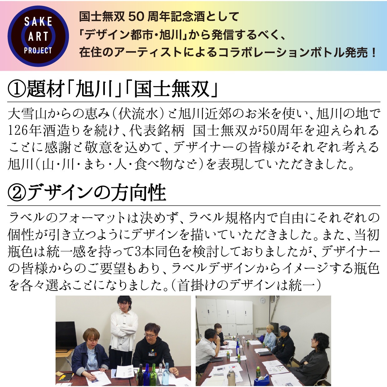 旭川市は2019年にユネスコの創造都市ネットワーク事業で「デザイン都市」として認定されていることから(現在、世界43都市で認定)、国士無双50周年記念に合わせて、日本酒を通して「デザイン都市・あさひかわ」の象徴となるような商品を開発したいという想いで、旭川市在住で活躍されている3名のデザイナーさんにお力添えいただきました。